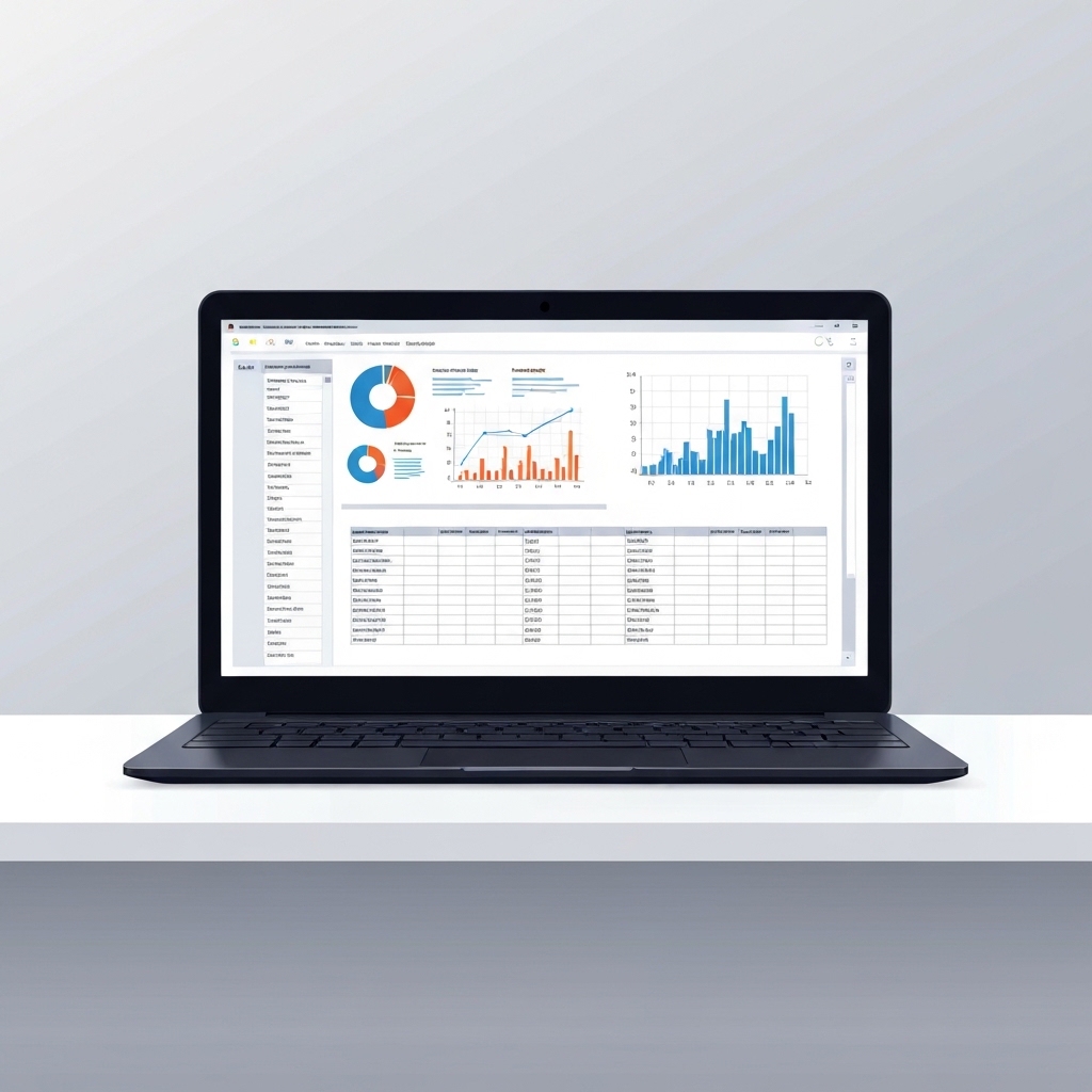 A clean, minimalist illustration of a laptop with an open Excel spreadsheet on the screen, featuring charts, graphs, and data tables. The laptop is placed on a sleek, modern desk with a white background.